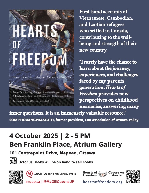 Hearts of Freedom: Stories of South East Asian Refugees,” releasing September 16, 2025 with McGill-Queen’s University Press, draws on 145 oral histories collected across Canada. Survivors recount oppression, genocide, perilous escapes, and the challenges—and kindnesses—of building new lives in Canada.